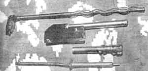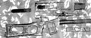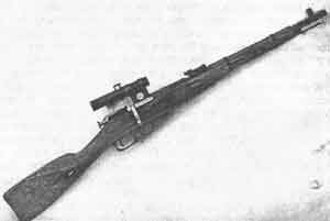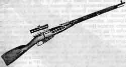 Трехлинейный карабин (укороченный вариант винтовки) впервые появился в 1907 году для вооружения кавалеристов. Немного модернизировался в 1938 году, а в 1944 году к нему был разработан неотъемный откидной штык. Эти карабины с отборными стволами или изготовленные на заказ обеспечивали кучность боя 5х4 см на дистанции 100 метров обычным патроном. Поэтому на них нередко ставили оптический прицел ПУ и применяли для работы в разведдиверсионных группах (фото 38). Короткие карабины оказались практичными, маневренными и удобными для работы в условиях населенных пунктов и поэтому применялись в НКВД, КГБ и милиции для обезвреживания вооруженных и особо опасных "клиентов". В обиходе короткий карабин с оптическим прицелом оказался настолько практичным, что продолжал применяться даже после вооружения вышеназванных ведомств хорошими, но чрезмерно Длинными для "полицейской" работы автоматическими винтовками СВД.