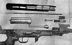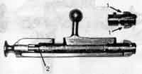 Принцип действия этого оружия основан на работе поворотного затвора (фото 2), продольно скользящего в ствольной коробке (7 на фото 3). При досылании затвора вперед он подхватывает патрон из магазинной коробки, выталкивает его за пределы воздействия отсечки-отражателя (7 на фото 4), которая . не дает патрону "вывалиться" вертикально вверх, и по направляющим пазам ствольной коробки подает патрон в патронник. При повороте рукоятки затвора вправо боевые выступы боевой личинки (7 на фото 2) поворачиваются на 90° и заходят за боевые выступы ствольной коробки. Таким образом, происходит запирание системы (схемы 1, 2, 3). При нажиме на спусковой крючок (7 на фото 5, 6) опускается шептало (2 на фото 5, 6), с которого срывается курок (3 на фото 5), ударник разбивает капсюль, происходит выстрел. При повороте рукоятки затвора вверх боевые выступы личинки и ствольной коробки выходят из взаимного зацепления, система отпирается, курок взводится взаимодействием его винтовой червячной геометрии с аналогичной винтовой геометрией торца стебля затвора (2 на фото 2). Таким образом, курок открытого затвора всегда будет взведен. При отведении затвора назад зацеп-выбрасыватель, запрессованный в боевой личинке, извлекает из патронника стреляную гильзу. Геометрия открытого затвора образует паз-желобок (7 на фото 7), которым затвор при движении назад скользит по зубу отсечки-отражателя (2 на фото 4). Извлекаемая гильза "наезжает" на этот зуб, отражается от него и выбрасывается в сторону зацепа наружу.