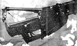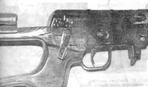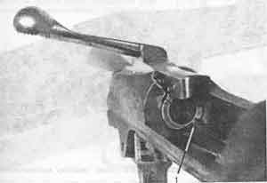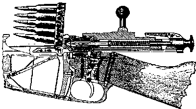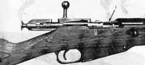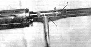 Фото 31. Изогнутая рукоятка затвора не задевает за оптический прицел. Магазин наполняется нажатием патрона сверху вниз. На снимке виден патрон, удерживаемый от выпадения вверх лопастью отсечки-отражателя