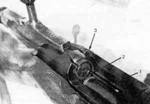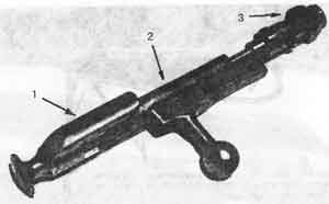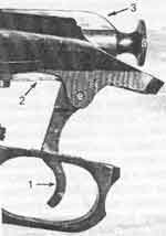 Фото 17. Разборка затвора. Удерживая курок 1, повернуть по часовой стрелке стебель затвора 2. В таком положении курок спущен. Подать вперед боевую личинку 3
