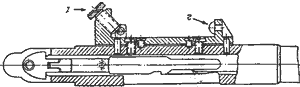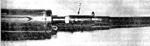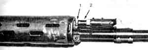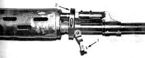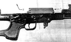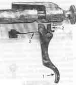 Фото 34. Винтовка, поставленная на предохранитель. Курок 1 с силой оттянуть назад, повернуть против часовой стрелки и отпустить. 2 - необходимый зазор