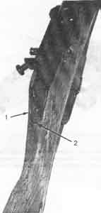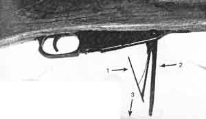 Стрелять из трехлинейной винтовки следует, плотно прижав приклад к плечу, иначе вместо глухого толчка при выстреле стрелок получит в плечо очень сильный удар, буквально сбивающий с ног. У правильно отлаженной винтовки всегда будет зазор между хвостовиком ствольной коробки и вырезом ложа (стрелка 2 на фото 21). Если такого зазора нет, при выстреле будет ощущаться противное резкое сотрясение, или, как говорят, винтовка "дерется".