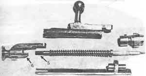 Фото 20. Разобранный затвор. Внимание: для обеспечения сборки затвора при навинчивании курка на ударник боек с силой упирается во что угодно до полного выхода резьбовой части ударника 5 из торцевой части стебля затвора. 6 - червячная геометрия взведения курка