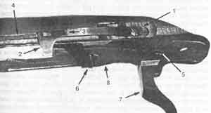 3 - крепежный винт M8,5, завинчивается изнутри через буферную втулку, вывинчивается при чистке оружия;