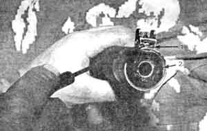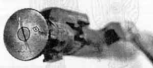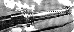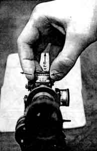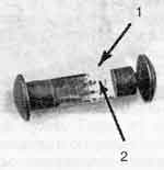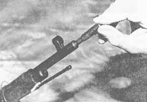 При выборе винтовки следует учесть, что среди нового оружия есть много бывшего на фронте и искусно отреставрированного. Оружие, долгое время бывшее в употреблении, имеет в передней части канала ствола "раструб". В ствол так или иначе попадает пыль, частички которой действуют как наждак, когда при выстреле пуля "тянет" их за собой. Как .известно, 1 грамм пыли "выносит" за собой 1 грамм металла. Поэтому существует простой способ выбора ствола: с дульной части в ствол вставляют пулю боевого патрона (фото 36) и с силой проворачивают ее там. На пуле остается "поясок" потертости. Чем ближе этот "поясок" к носику пули, тем выше качество ствола. Таким образом, из нескольких стволов можно предварительно выбрать лучший. Бывает, что пуля полностью проваливается в ствол даже с дульцем гильзы. Такое оружие бьет сильно, но кучности стрельбы не будет. Тогда сверлом Ф-10 канал ствола со стороны дульного среза высверливается на глубину 4-5 см. Раструб при этом "убирается", кучность практически восстанавливается, но оружие надо пристреливать заново. Если патронник раздут настолько, что стреляные гильзы не выходят после выстрела, патроны необходимо смазывать парафином.