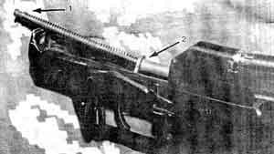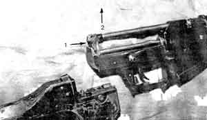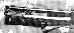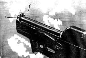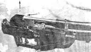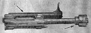 Фото 16. Неполная разборка. Извлечение затвора. При нажатом спуске 1 открытый затвор извлечь по направлению стрелки 2. В ствольной коробке видна лопасть-пластина отсечки-отражателя