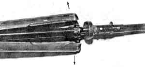 Теперь о тонкостях конструкции, делающих ее предельно надежной. Патроны трехлинейной винтовки имеют шляпку-закраину, которая гарантирует зацепление гильзы выбрасывателем. Кроме того, гильзы такой формы не "затирает" песком в механизме. Но в свою очередь эта закраина при продольном движении патрона по механизму "цепляет" все на своем пути, в том числе и закраины других патронов. У винтовки системы Нагана из-за этого в ствол частенько подавалось сразу по два патрона, что приводило к заклиниванию оружия. Мосин этот недостаток ликвидировал введением в свою конструкцию особой детали - отсечки-отражателя, представляющей собой подпружиненную пластинку с зубом (схема 4, фото 9). Пластинка эта помещается зубом внутрь в прорези ствольной коробки (7 на фото 10). Стебель затвора в поперечном сечении эксцентричен (фото 11). Когда затвор открыт, зуб отсечки-отражателя находится в глубине эксцентрика (7 на фото 11). В таком положении пластина-лопасть выступает из корпуса ствольной коробки и удерживает верхний патрон заполненного магазина от выпадения вверх. В свою очередь отсекающий зуб пружинной части (7 на фото 9) выдвинут в полость магазинной коробки (7 на фото 12) и находится между верхним патроном и теми, которые расположены ниже. Когда верхний патрон выталкивается затвором вперед, зуб пружины удерживает остальные от подачи вверх - он их "отсекает". При повороте затвора вправо эксцентрик стебля (еще раз посмотрите на фото 11) нажимает на зуб лопасти-пластины и "утапливает" ее в паз ствольной коробки, заодно и "утапливая" в сторону зуб пружины, "отсекающий" патроны. Подпружиненные снизу патроны подаются вверх, полость под затвором снова заполняется. После выстрела затвор открывается, отсечка-отражатель снова становится в первоначальное положение. При открытом затворе патрон, поднявшийся из магазина вверх, будет фиксирован снизу отсекающим зубом пружины, сверху - лопастью-пластинкой отсечки-отражателя (схема 5). Он не может двигаться ни вверх, ни вниз. Он разобщен с остальными патронами, и его закраина уже ничто не сможет зацепить при продвижении патрона вперед, в ствол. Отсечка-отражатель выполняет двойную функцию - отсекает патроны от ненужной подачи и отражает стреляную гильзу.