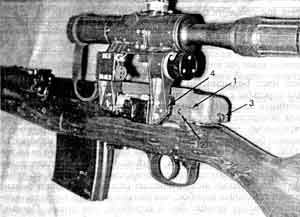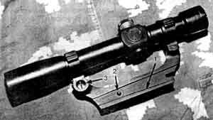Фото 107. Прицел ПСО-1 на винтовке СВТ (вид справа). Прицел смещен влево от оси ствола. При этом стрелку удобнее целиться и есть возможность наполнить магазин из обоймы сверху (стрелка 1). 2, 3 - крепежные винты М4