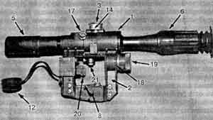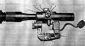 4 - при необходимости смещения корпуса прицела по сторонам в этом сочленении прокладываются тонкие металлические прокладки