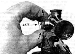 Фото 100-А. Вид сбоку на горизонтальный маховик прицела ПСО-1. Обозначение направления средней точки попадания (СТП)