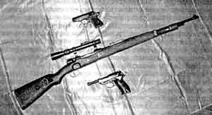 Фото 104. Арсенал немецкого снайпера. Винтовка "Маузер-7,92", пистолеты "Вальтер ППК" и "Вальтер П-38"