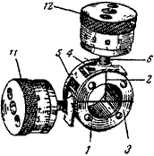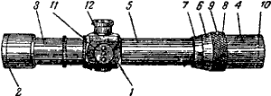 1 - горизонтальный волосок (нить); 2 - вертикальный волосок (нить); 3 - шайба перекрестия; 4 - ползунок; 5 - оправа перекрестия; б - винт; 11 - маховичок со шкалой боковых поправок; 12 - маховичок со шкалой дистанций