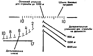 При увеличении дальности стрельбы вертикальный дистанционный маховик вращается по часовой стрелке (если смотреть на него сверху), при этом прицельные нити (или сетка) уходят вниз, ствол винтовки поднимается вверх и пули, соответственно, тоже уходят вверх (схема 19). При уменьшении дальности стрельбы вертикальный дистанционный маховик вращают против часовой стрелки; при этом прицельные нити (сетка) уходят вверх, а пули, соответственно, пойдут ниже. Как уже было сказано ранее, шкалы дистанционных маховиков отградуированы в сотнях метров (схема 20). Поэтому после визуального определения дистанции до цели дистанционный маховик выставляется соответствующей цифрой против контрольной риски. Такой принцип вертикальных дистанционных поправок одинаков для прицелов ПУ, ПЕ, ПБ и ПСО-1.