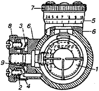 1 - оправа перекрестия; 2 - стопорный винт; 3 - отжимная шайба; 4 - лимб шкалы боковых поправок; 5 - лимб шкалы вертикальных поправок; 6 - корпус механизма; 7 - маховичок установки дальности (углов прицеливания); 8 - маховичок боковых поправок