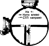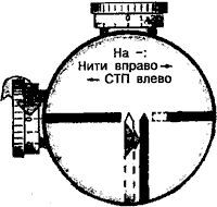Горизонтальные (боковые) поправки (на ветер и по движущимся целям) производятся вращением горизонтальных (боковых) маховиков. На шкале боковых поправок нанесены деления со знаком + (плюс) для поправок вправо и со знаком - (минус) для поправок влево, всегда по 10 делений в каждую сторону. Занумерованы только пятое и десятое деления. Каждое деление соответствует одной тысячной дистанции. Но на прицелах разных типов боковые маховики вращаются не в одну и ту же сторону. На прицелах ПУ, ПЕ, ПБ они находятся слева, чтобы не мешать открыванию затвора вручную на неавтоматических трехлинейных винтовках (фото 98), а на прицеле ПСО-1, предназначенном для автоматической винтовки СВД, боковой маховик расположен справа (фото 99). Следовательно, боковые маховики вращаются в разных направлениях. На прицелах ПУ, ПЕ, ПБ при вращении бокового маховика (имея его перед собой) против часовой стрелки, от 0 на плюс, нити уходят влево, а пули (средняя точка попадания) пойдут вправо (схема 21). При вращении же его по часовой стрелке, от 0 на минус, нити уходят вправо, а средняя точка попадания, естественно, влево (схема 22).