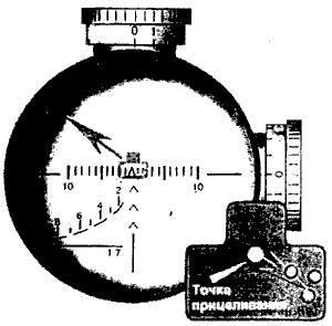 Фото 100-Б. Вид сверху на дистанционный маховик прицела ПСО-1. Обозначение направления средней точки попадания (СТП)