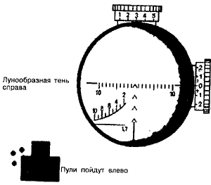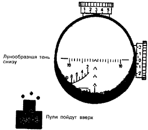 При правильном прицеливании глаз стрелка должен находиться строго на оптической оси прицела (схема 28). Это значит, что зрительное поле прицела должно быть абсолютно чистым, его периметр строго очерченным, без полулунных (или, как еще говорят, лунообразных) затемнений и теней по краям. Пули всегда уйдут в сторону, противоположную даже незначительному полулунному затемнению, причем уйдут довольно далеко от точки прицеливания (схемы 29-31). Глаз размещается на таком расстоянии от окуляра прицела, при котором его зрительное поле будет видно полностью, во всю величину, не ближе и не дальше от этого оптимального расстояния.