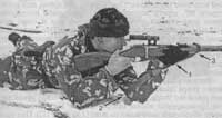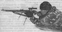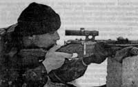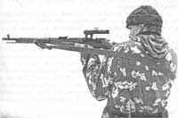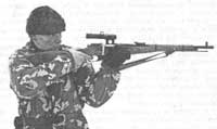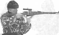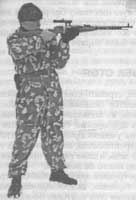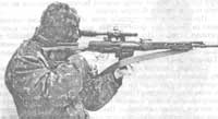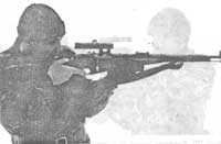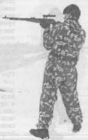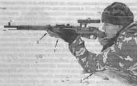 Фото 125. Стрельба стоя из винтовки СВД с удержанием оружия под магазин. Левый локоть опирается "на ребра", ремень перехлестнут через магазин