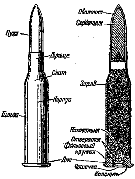 Боевой патрон для стрелкового оружия состоит из пули, порохового заряда, гильзы и капсюля (схема 107).