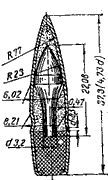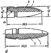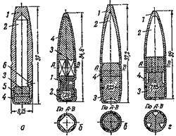 Назначение ведущей части - придать пуле надежное направление и вращательное движение, а также плотно заполнить канавки нарезов канала ствола для того, чтобы устранить возможность прорыва пороховых газов. По этой причине пули по толщине выполняются большим диаметром, чем номинальный калибр оружия (табл. 38).