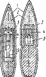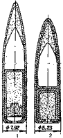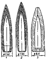 Патроны с бронебойными пулями предназначены для поражения противника за бронированными укрытиями. От обыкновенных пуль бронебойные отличаются наличием броневого сердечника высокой прочности и твердости. Между оболочкой и сердечником обычно находится мягкая свинцовая рубашка, облегчающая врезание пули в нарезы и предохраняющая канал ствола от интенсивного износа. Иногда бронебойные пули не имеют специальной рубашки. Тогда оболочка, являясь корпусом пули, изготавливается из мягкого материала. Так устроена французская бронебойная пуля (3 на схеме 121), состоящая из томпакового корпуса и стального бронебойного сердечника. Носик бронебойной пули окрашен в черный цвет.